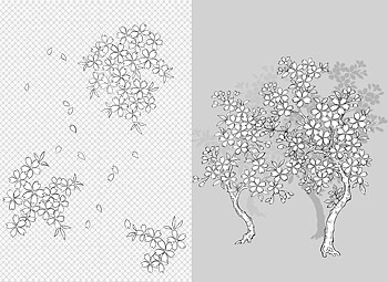 Description:Japanese line drawing of plant material -41 Vector flowers (cherry blossoms, classical background)